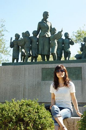 「二十四の瞳」の舞台。ということで、銅像の前で記念写真。